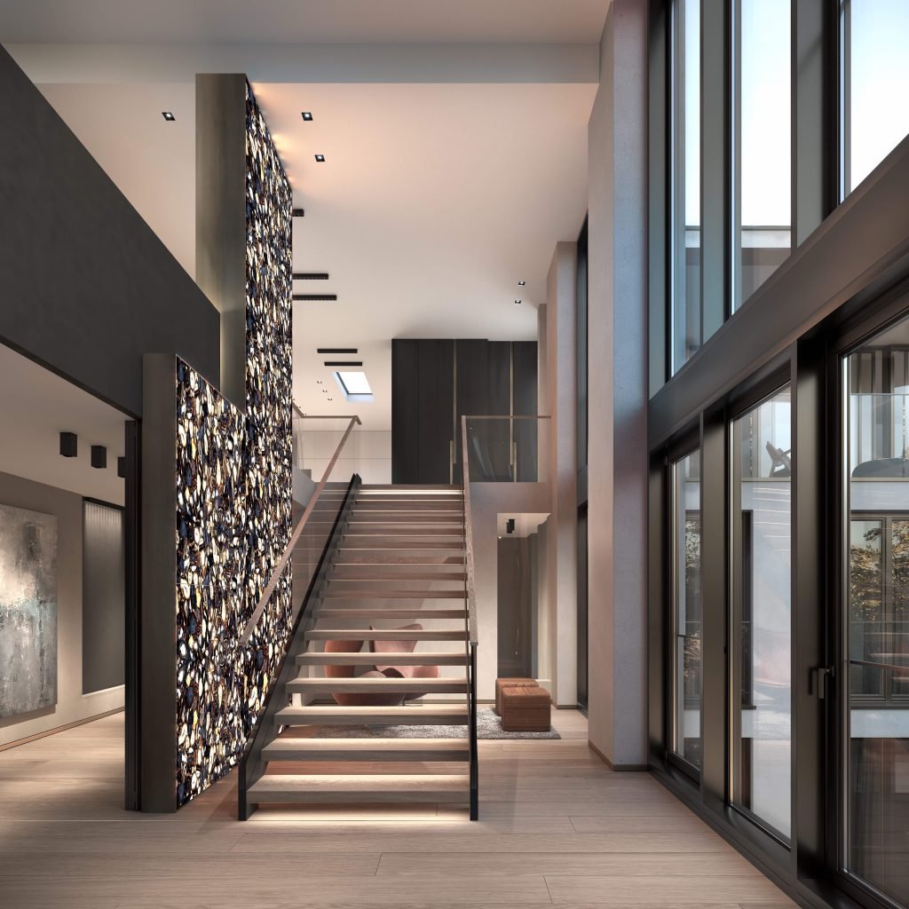 Das Interieur ist eine raffinierte Kombination aus Schiebetüren, schaltbarem Glas, Verkleidungen in Massivholzoptik und -struktur, Linoleum und polierten Metalloberflächen, weißen Marmorverkleidungen mit reduzierter Maserung, doppelstöckigen hinterleuchteten Quarzit Wänden und Messingwänden.